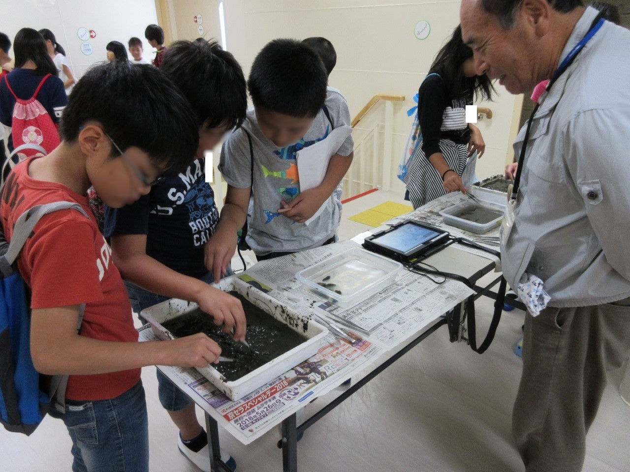 湖底から泥や砂れきを採取して、湖底に生息する生き物や、湖底の環境などについて調べられるよう、児童のサポートします。