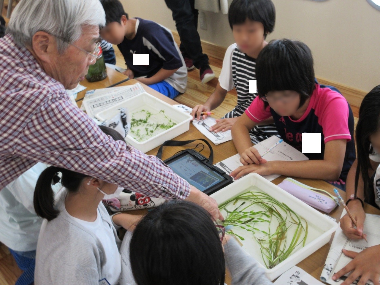 よごれたびわ湖の水がどれくらいで元通りになるか、実験を通して考えられるよう、児童のサポートをします。