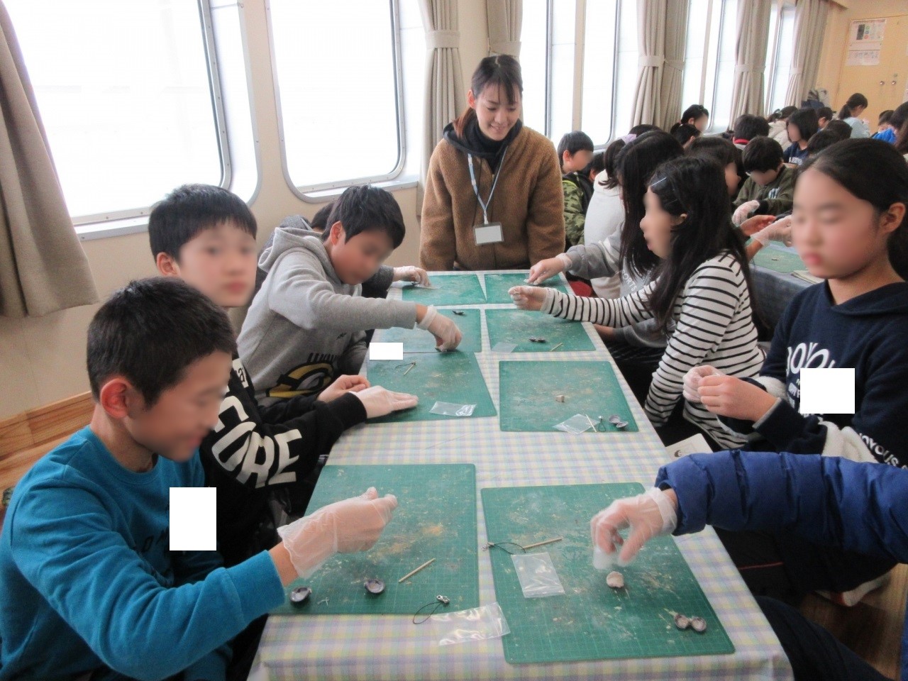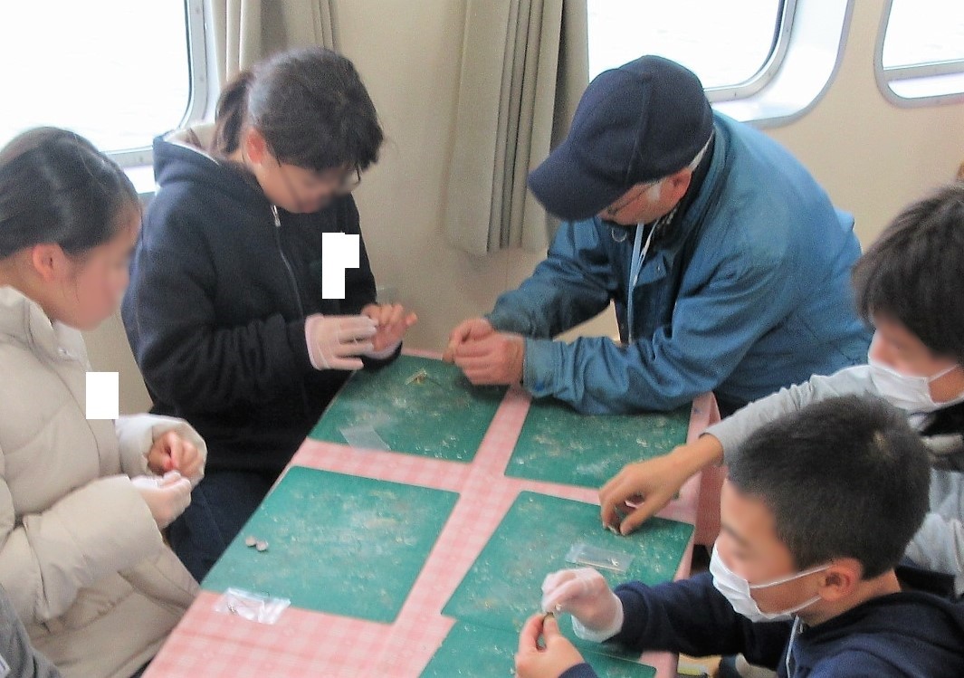びわ湖固有の貝や生き物について考えたり、シジミを使ったストラップを作ったりする児童の活動をサポートします。