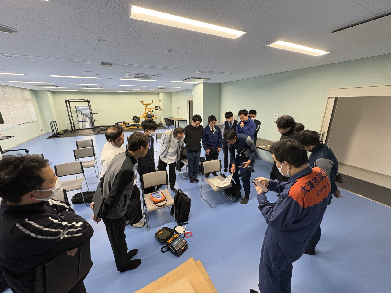 学習船「うみのこ」に乗船する児童の事故やけがなど、万一の事態に備え、4月8日(水)大津市中消防署で普通救命講習会を行いました。講習会には、フローティングスクール職員、「うみのこ」船員、食堂職員が参加し、119番通報の際の注意事項や心肺蘇生法、AEDの使用方法について学びました。実技講習では心肺蘇生用のキットを使用し、参加者が迅速かつ適切に対応できるように講習を受けました。また、Live119映像情報システムを紹介いただき、実際に119番通報をして消防指令センターの方と実技訓練を行いました。このサービスを活用することで、言葉では伝えることが難しい負傷者の様子や現場の状況を消防センターの方とリアルタイムで把握することができます。今年度全102航海、すべての乗船児童の安全を確かなものとするため、今後も様々な訓練に取り組んでいきます。
