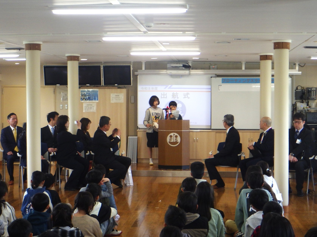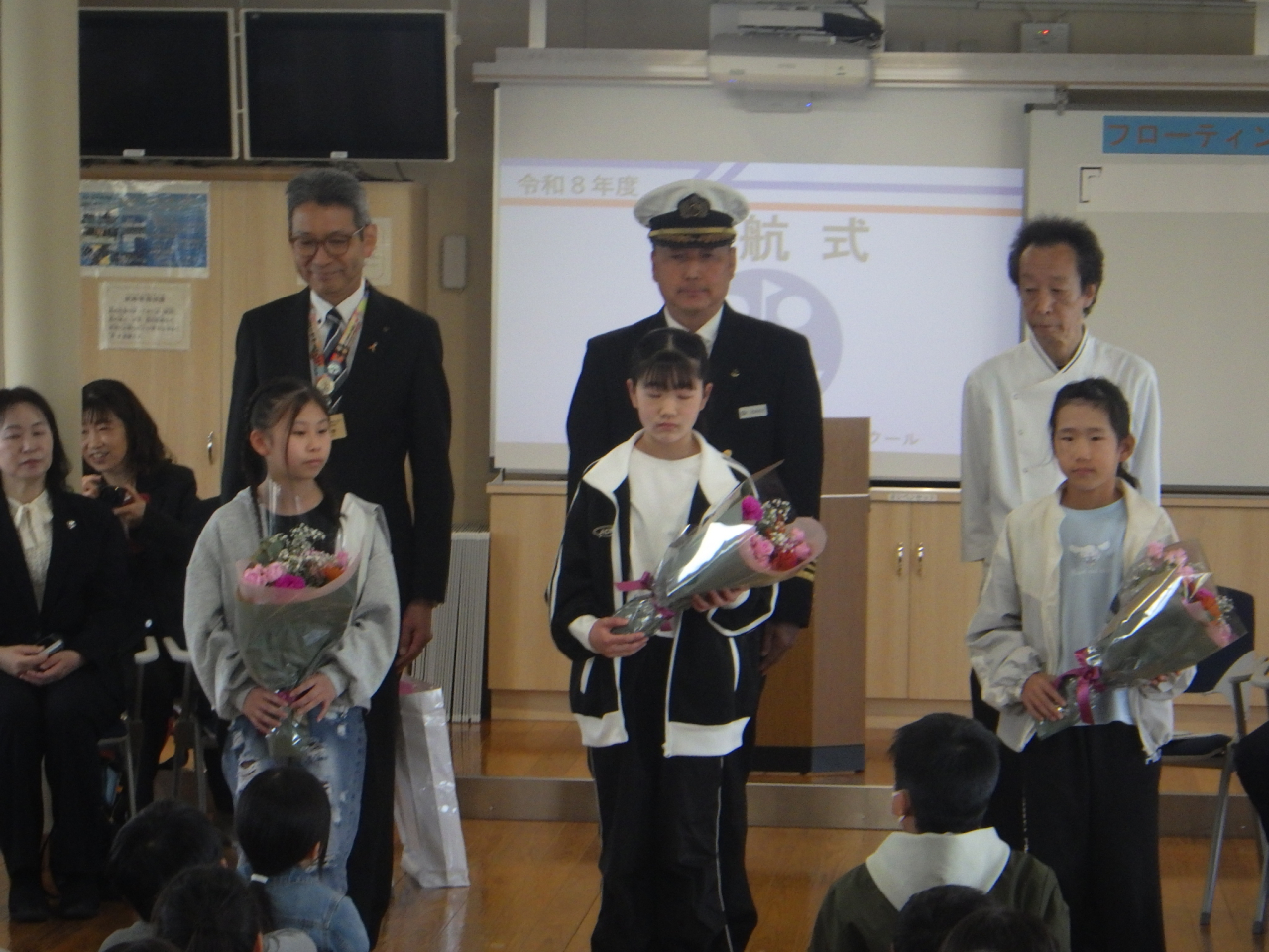 令和8年度の児童学習航海がスタートしました。琵琶湖大橋港にて、日野町教育委員会教育長様をはじめ、多くのご来賓の皆様にご臨席いただく中、日野町立日野小学校、西大路小学校、南比都佐小学校、桜谷小学校の児童126名が学習船「うみのこ」に乗船し、出航式を執り行いました。児童は、これから始まる2日間のフローティングスクールに「びわ湖学習が待ち遠しい。」「船での食事を味わうのが楽しみ。」「多くの新しい仲間と交流したい。」と期待をふくらませていました。昨年度に引き続き、安心・安全な航海に努めていきます。